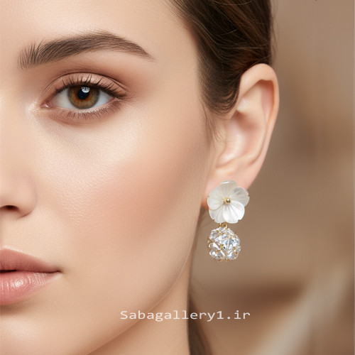 گوشواره میخی گل صدفی با آویز کریستالی | جواهرات زنانه شیک و براق